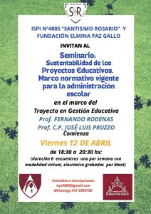 - Seminario: “Sustentabilidad de los proyectos educativos. Marco normativo vigente para la administración escolar”. Abril.
