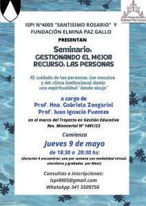 La Fundación Elmina Paz Gallo en co-organización con el Instituto Superior de Profesorado Santísimo Rosario de Rosario, Santa Fe (ISPI 4005) desarrolló las siguientes actividades de capacitación: